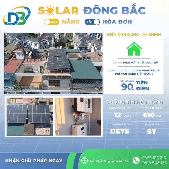 Hệ thống điện năng lượng mặt trời lưu trữ 12kwp vừa được hoàn thiện bởi các kĩ sư Solar Đông Bắc vào ngày 02/1/2026, hệ thống đã được bàn giao với chủ đầu tư và đi vào hoạt động.