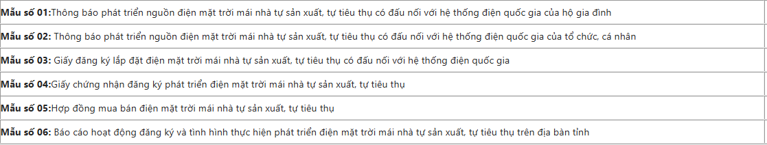 Công suất ≥ 1 000 kW: Bắt buộc xin Giấy chứng nhận đăng ký phát triển (Mẫu 03 → sau đó Mẫu 04), và nếu bán điện dư thì cần xin giấy phép hoạt động điện lực. Dưới đây là 06 biểu mẫu về điện mặt trời mái nhà tự sản, tự tiêu được quy định tại phụ lục kèm theo Nghị định 58/2025/NĐ-CP: